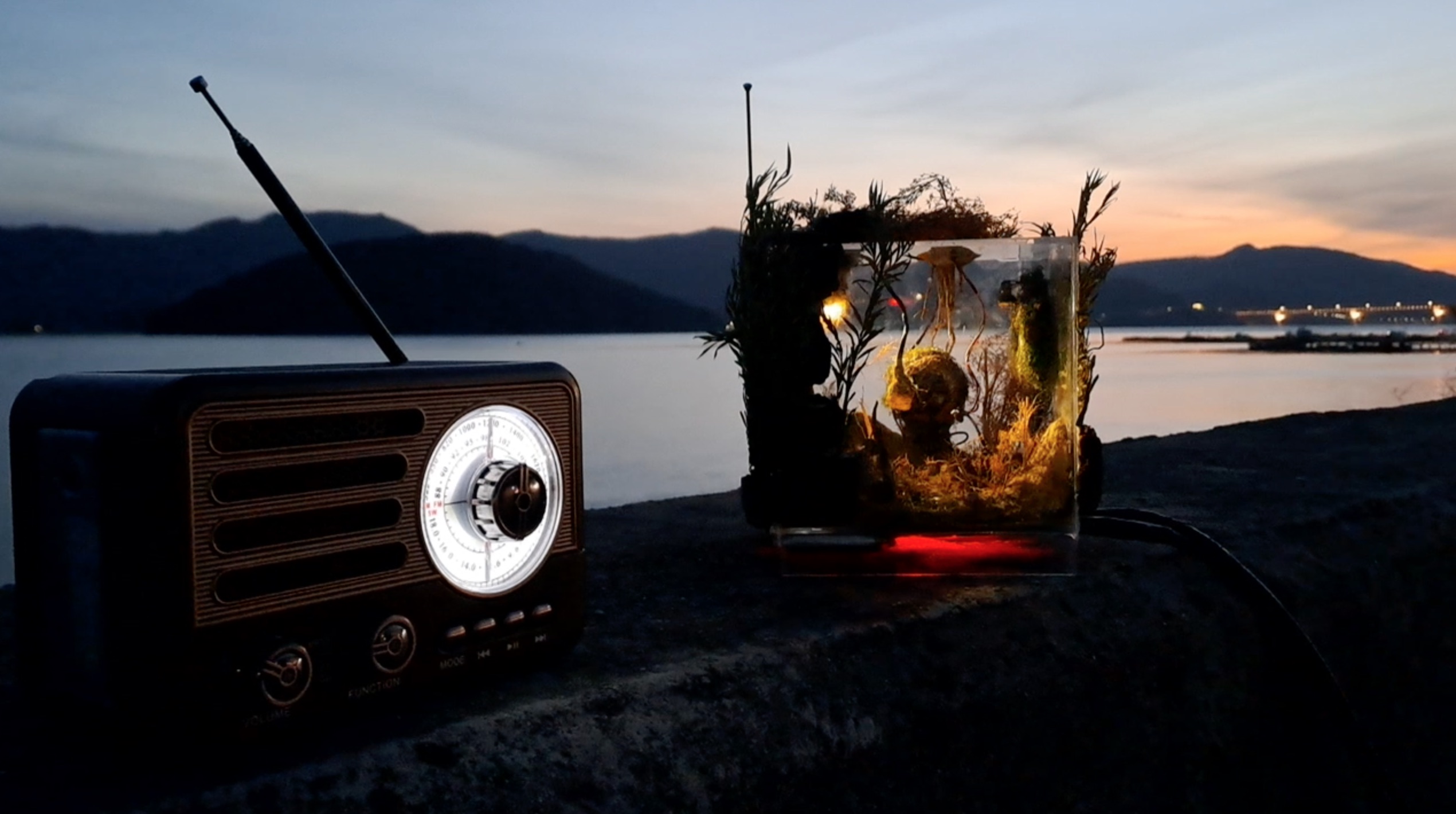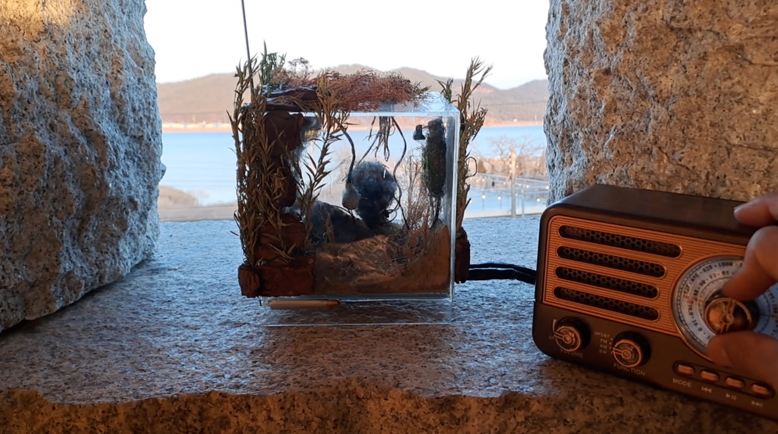 두 손에 잡혀지는 라디오는 관람객에게 선택의 순간을 제시한다. 우주 만물의 구성을 흙 – 불 – 물 – 공기로 보고 그 조화의 비례를 에테르로 가정한 티마이오스의 세계관에 들어서는 입구는 일방향으로 청취되는 전파 시스템의 숫자들 그 어느 사이에 숨겨져 있다.